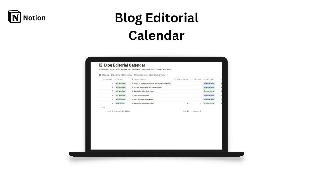 Don't let disorganization hinder your blogging success. Take control of your content production with our Editorial Calendar Notion template – the ultimate tool to bring order to your creative chaos. Invest in your blog's future today!